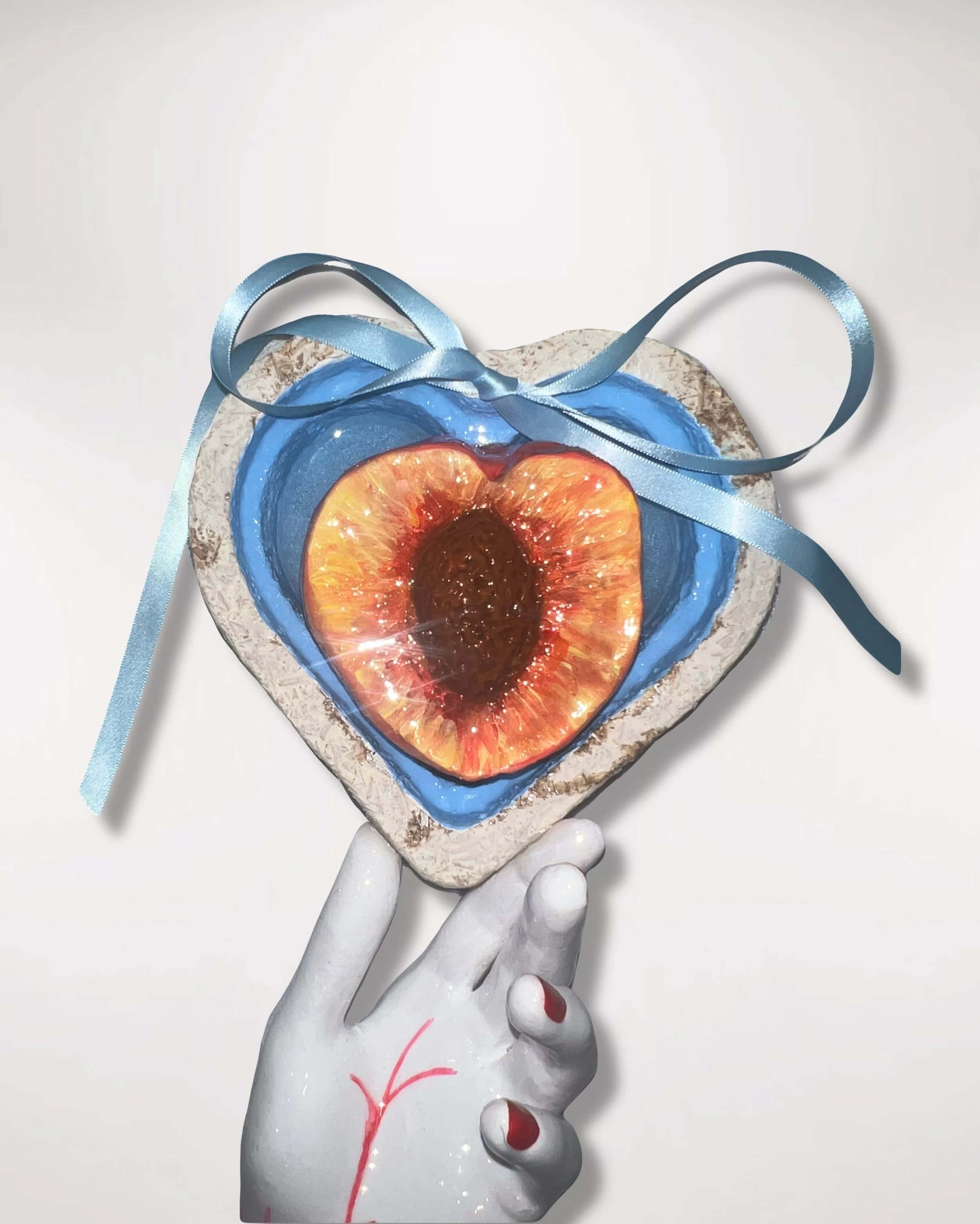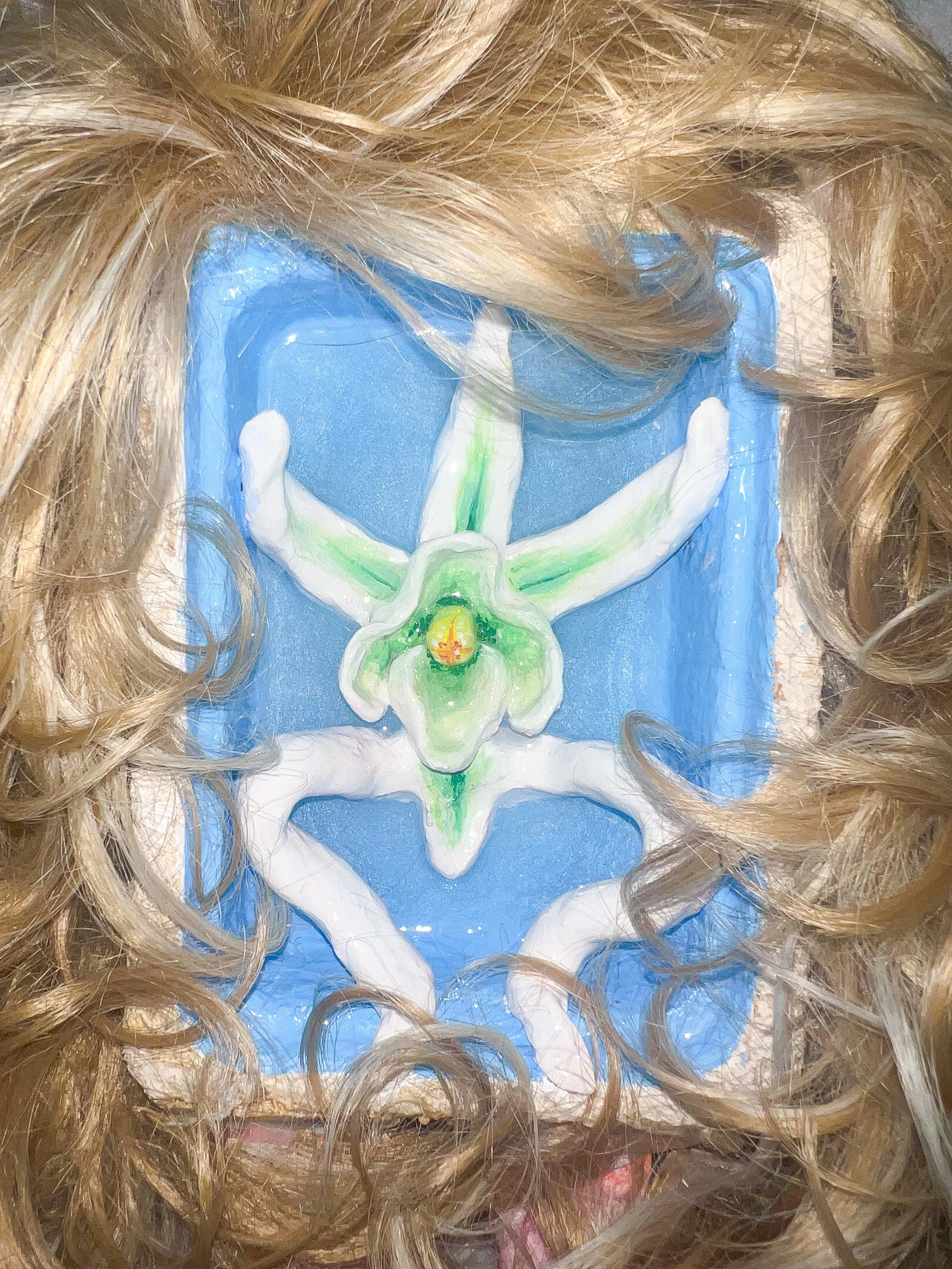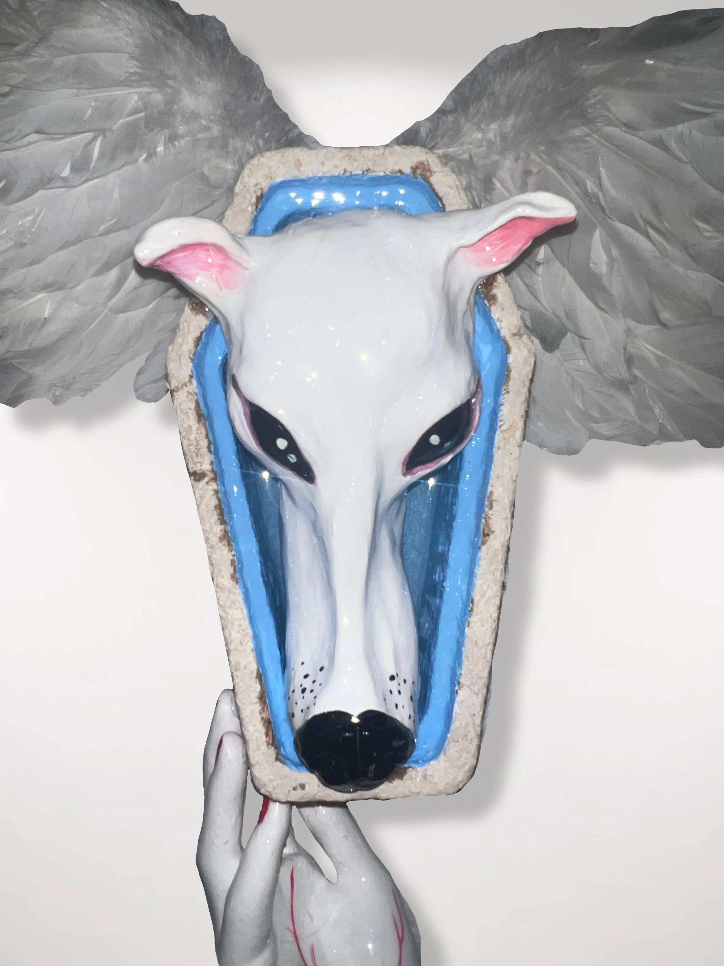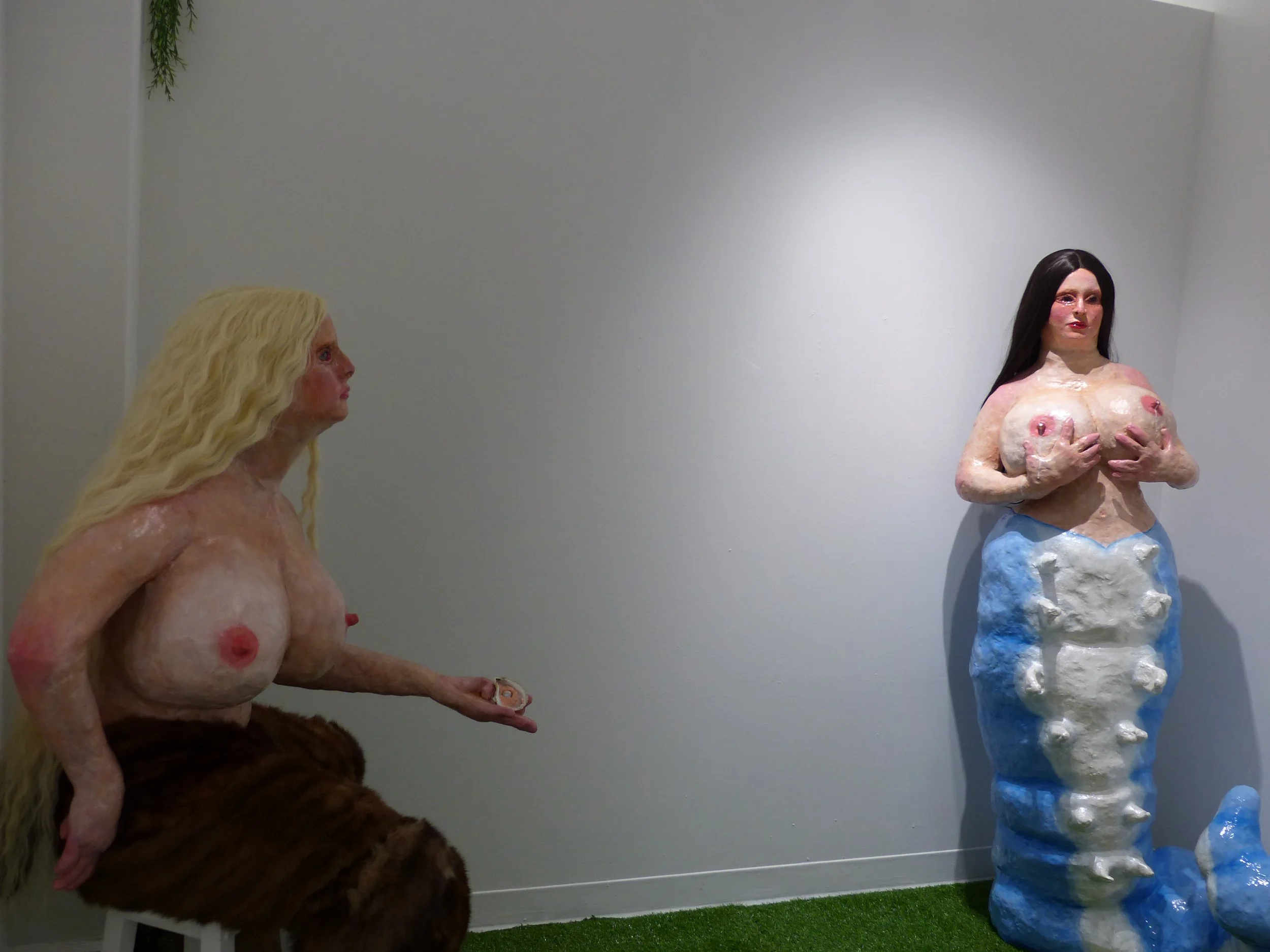 2023, plaster; ceramic; acrylic paint; epoxy resin; silk bow; feathers; glue; alternative mycelium polystyrene, 2.5x4’