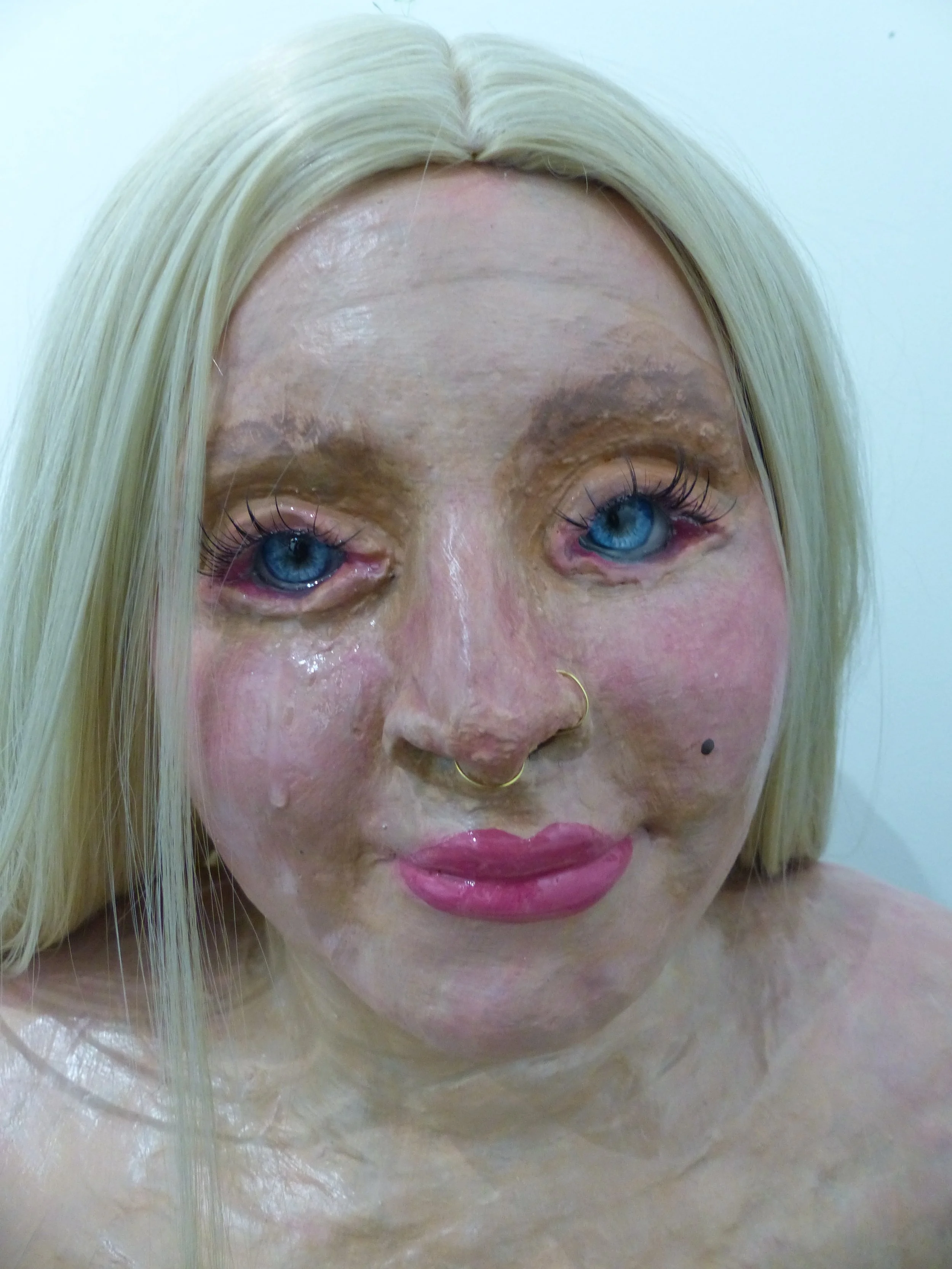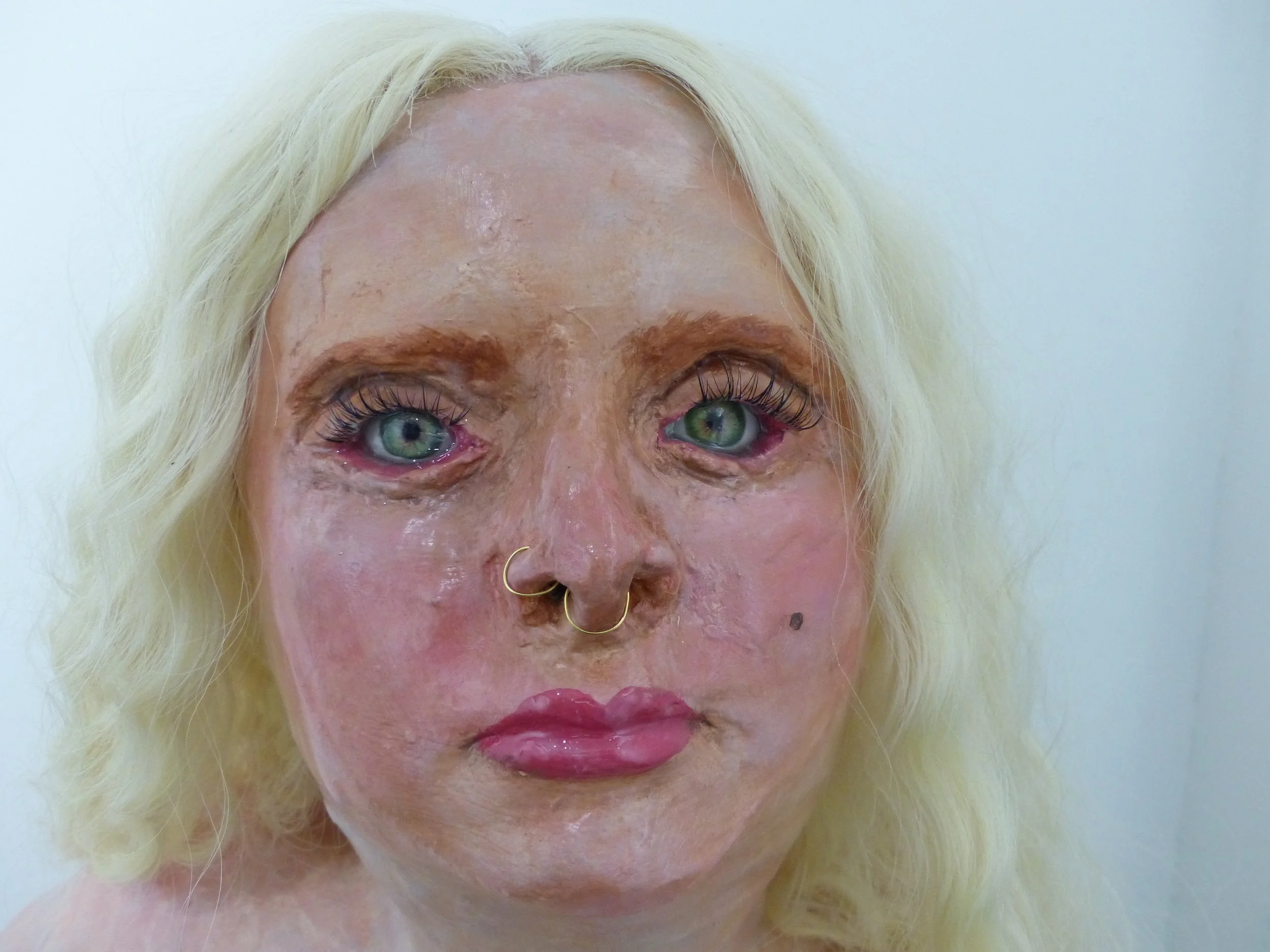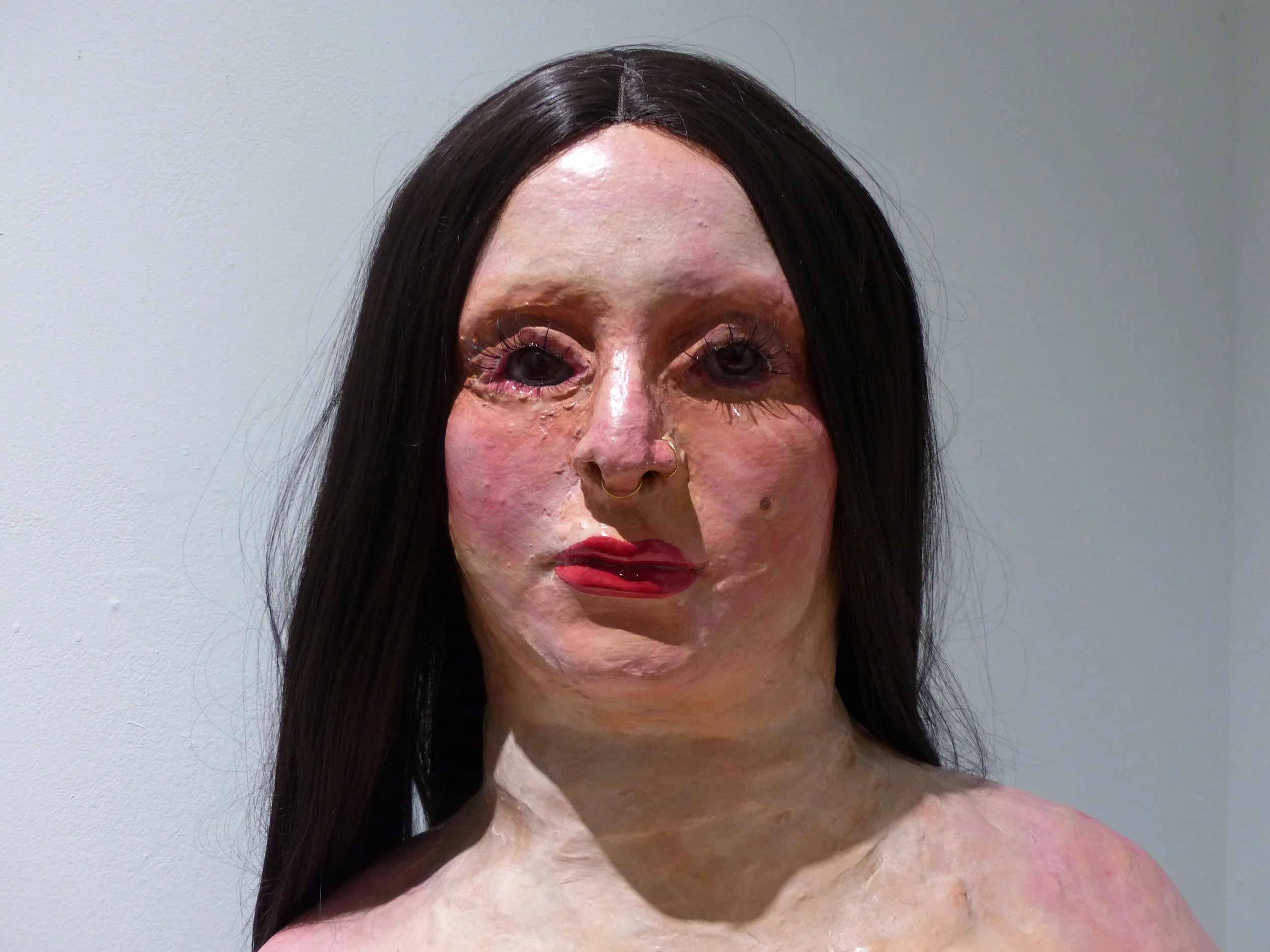 2023, duct tape; recycled paper; chicken-wire; plaster; Apoxie Sculpt; paper clay; acrylic paint; synthetic hair and lashes; glass eyes; epoxy resin, approx. 6x3x2’