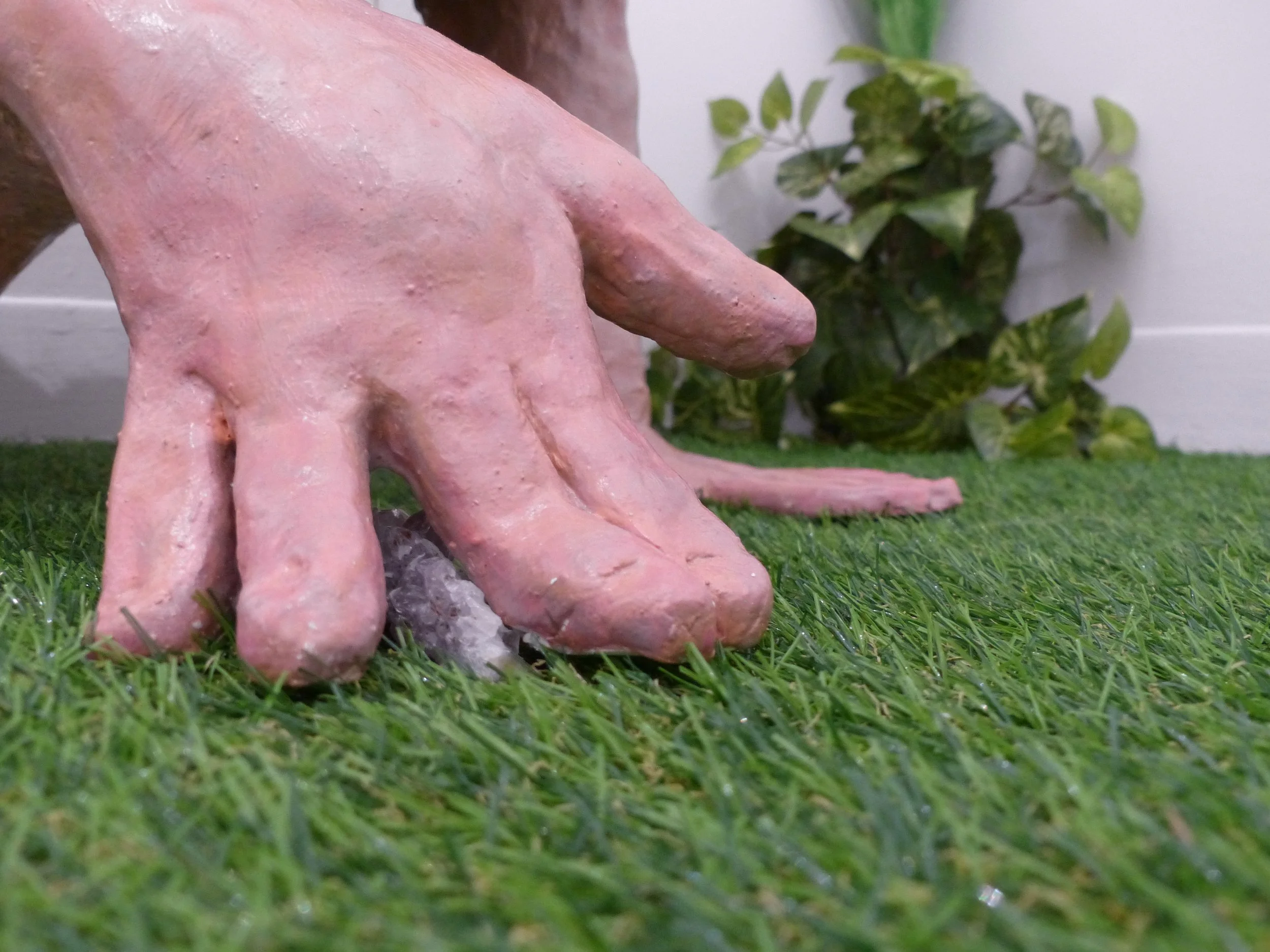 2023, duct tape; recycled paper; cardboard; plaster; Apoxie Sculpt; paper clay; acrylic paint; synthetic hair and lashes; glass eyes; amethyst crystals; epoxy resin, approx. 3x6x2’