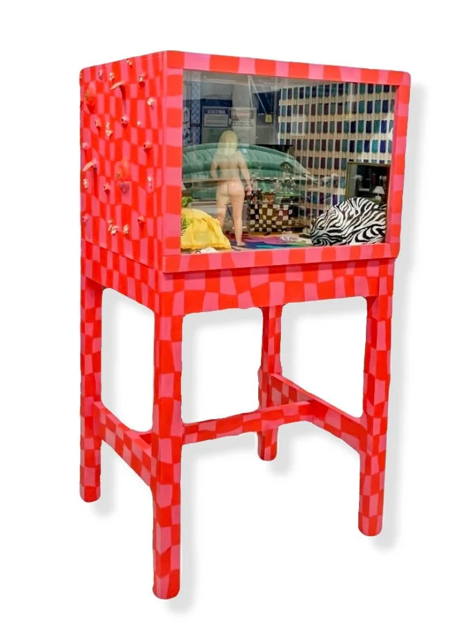 2021, wood; acrylic paint; electrical wiring; iPad; fabric; rope; plastic; brass; ceramic; paper; silicone; Apoxie Sculpt; plexi glass; synthetic hair; synthetic teeth; mirrors, 67.5x25.5x33”