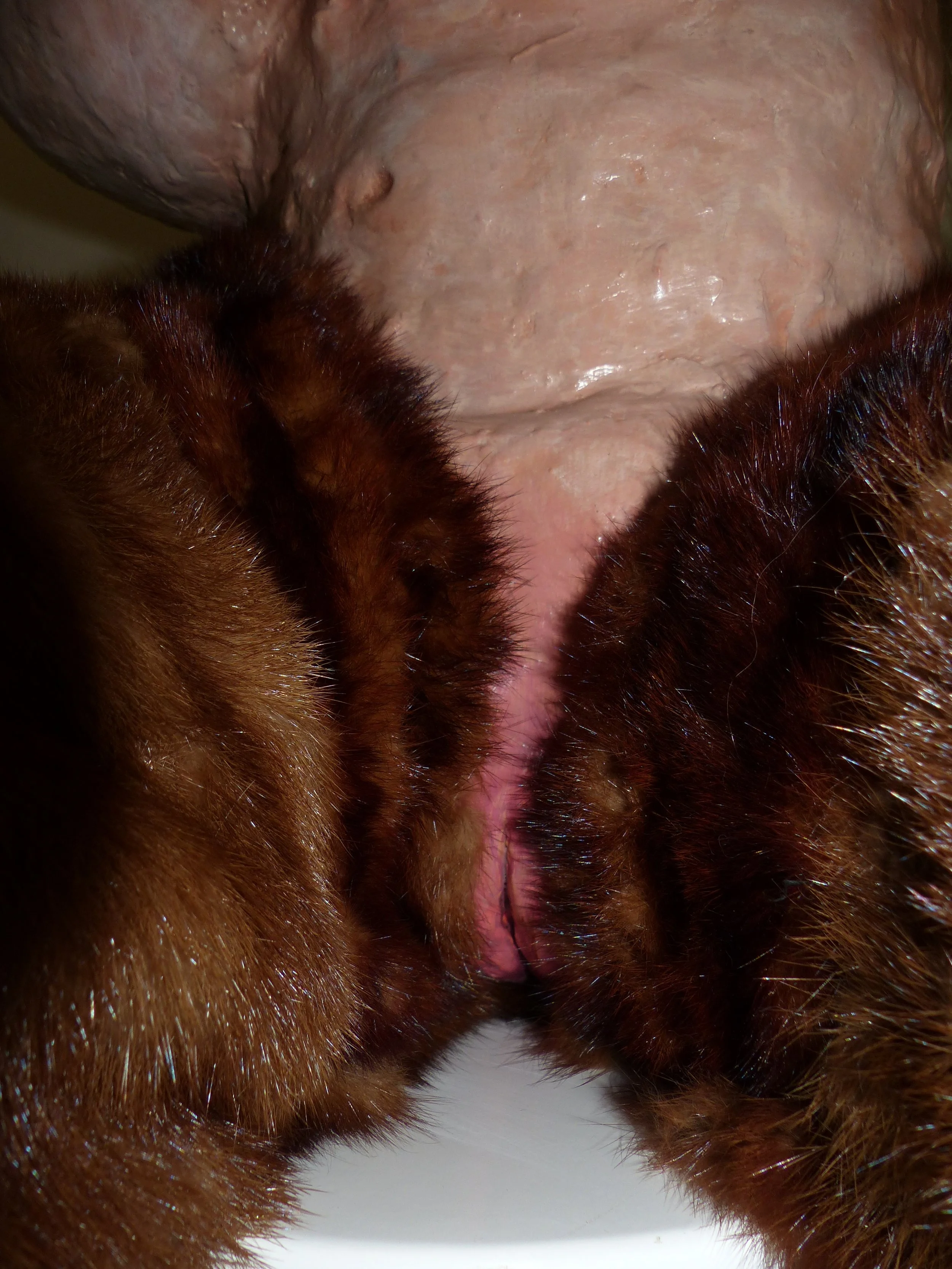 2023, duct tape; recycled paper; plaster; Apoxie Sculpt; paper clay; acrylic paint; synthetic hair and lashes; glass eyes; vintage fur; oyster shell; found stool; epoxy resin, approx. 4.5x3x2.5’